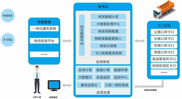 系統(tǒng)主要由前端嵌入式物聯(lián)設(shè)備、自適應(yīng)負載均衡總線、集中管控云平臺、綜合數(shù)據(jù)云底賬監(jiān)控平臺等組成,實現(xiàn)前端物聯(lián)設(shè)備分散式接入、集中管理,智能卡口云平臺集中部署,云底賬大數(shù)據(jù)智能分析,全面兼容各類卡口硬件和業(yè)務(wù)流程,實現(xiàn)物流底賬與車輛通行集中驗放管理。通過云平臺集中部署,實現(xiàn)前端物聯(lián)設(shè)備自適應(yīng)接入與智能化運行狀態(tài)分析,實現(xiàn)系統(tǒng)軟件插件式集中管理,以及不同卡口功能模塊的集中配置與推送。